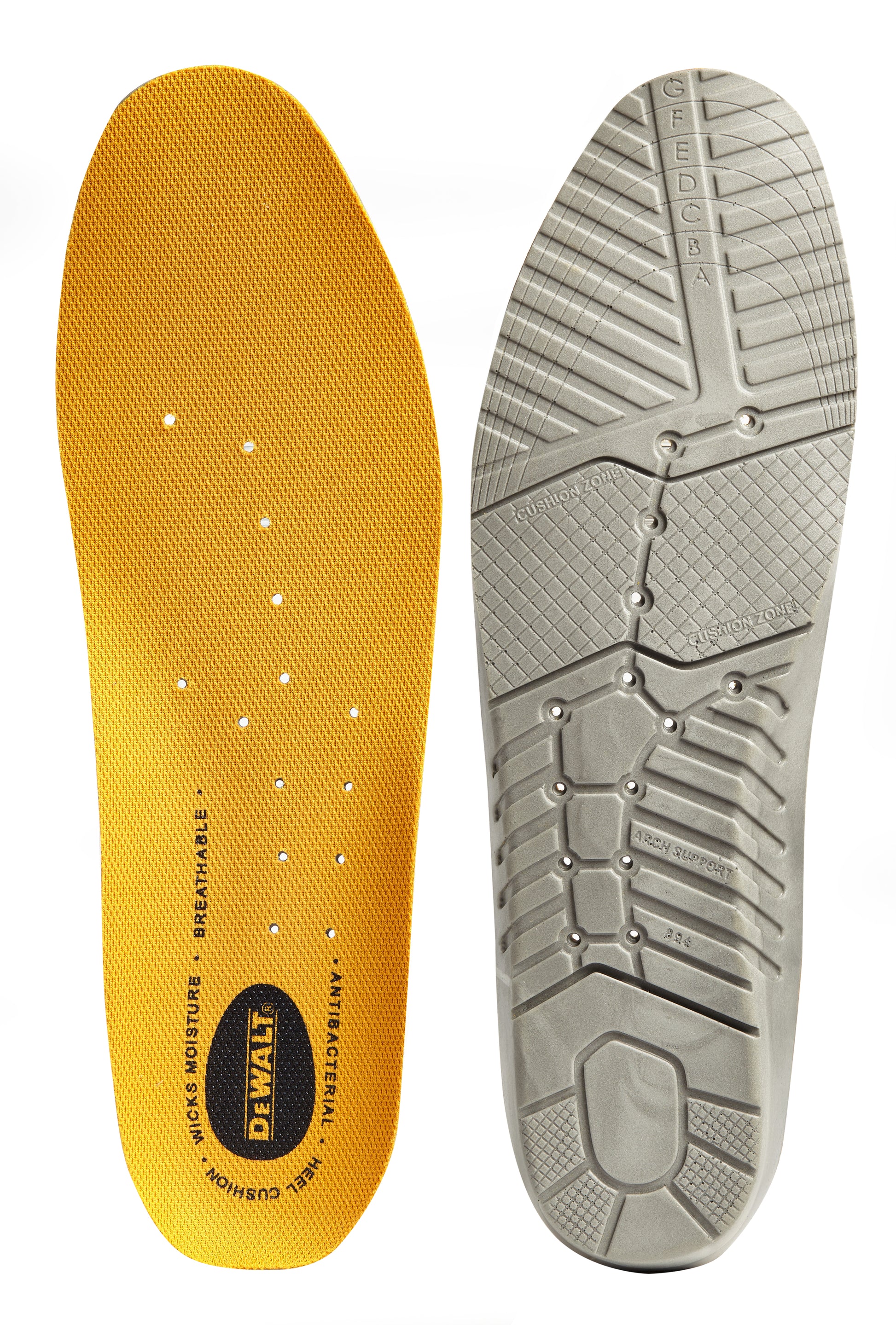 Comfort replacement insoles. Anti-bacterial to reduce odour. Moisture wicking system. Perforated for brethability. High degree of cushion comfort including arch support. Universal cut to fit size. A suitable replacement for all DeWalt safety footwear.