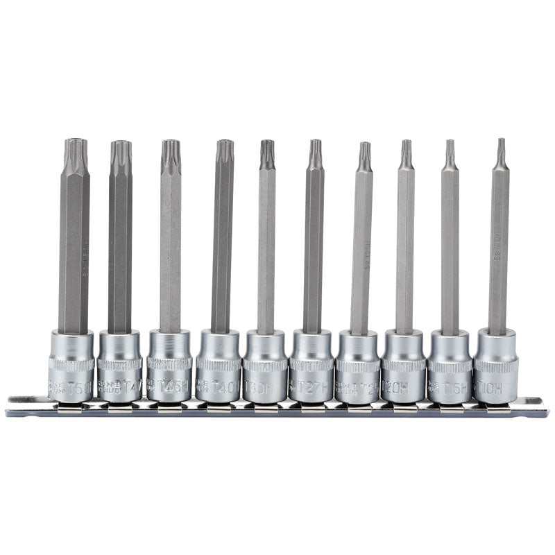 Expert Quality, 10 Draper TX-STAR® security socket bits, 100mm long. All sockets manufactured from hardened and tempered chrome vanadium steel with sand blasted bits of S2 silicon steel. Each socket has a knurled ring for extra grip. Supplied on a steel socket retaining rail. Display packed.