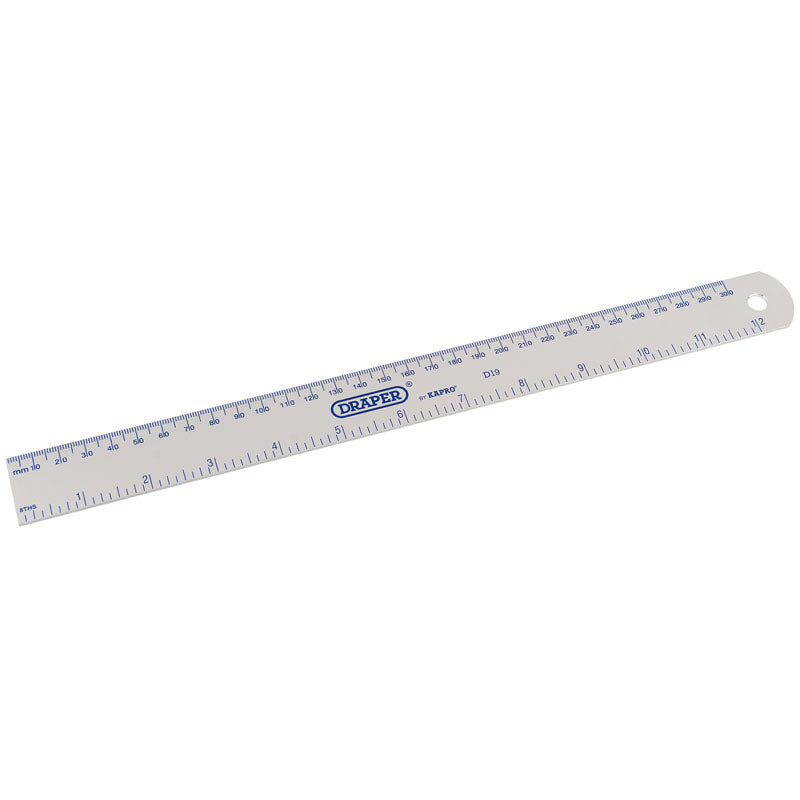 Extruded from 30mm wide anodized aluminium. Clearly graduated both sides mm/cm, inches, 1/8" and metric/imperial equivalents of length, area, volume and weight. Display packed.