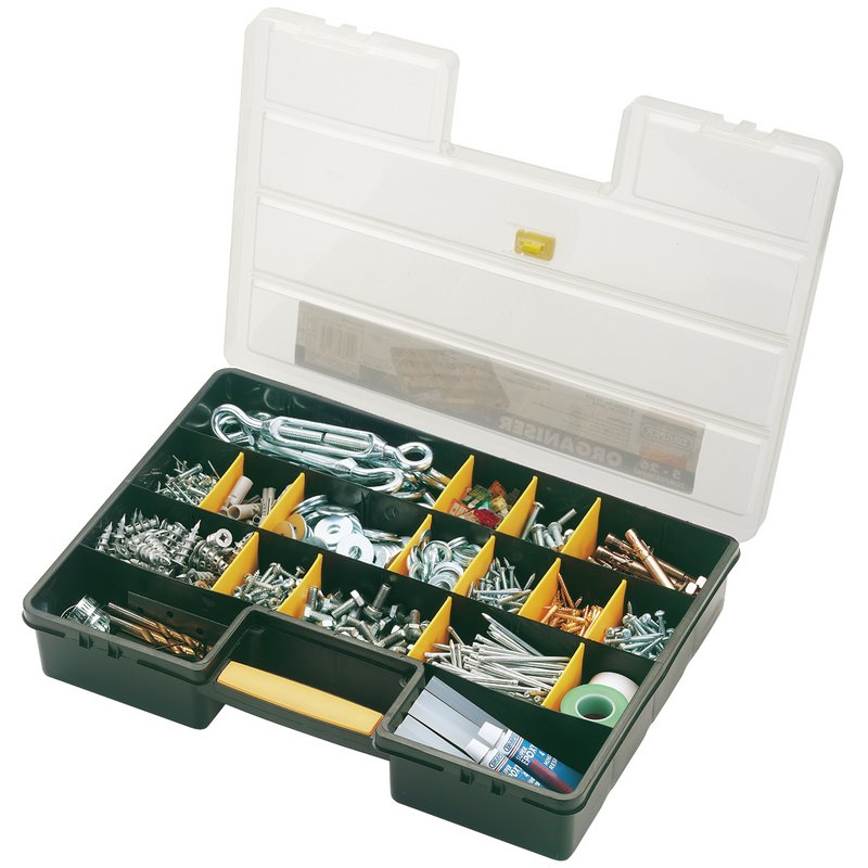 Plastic organiser with an adjustable matrix of storage compartments. The 21 removable dividers can make from 5 to 26 compartments. Case has a carrying handle with 'snap fit' closures and clear lid. Sold loose.