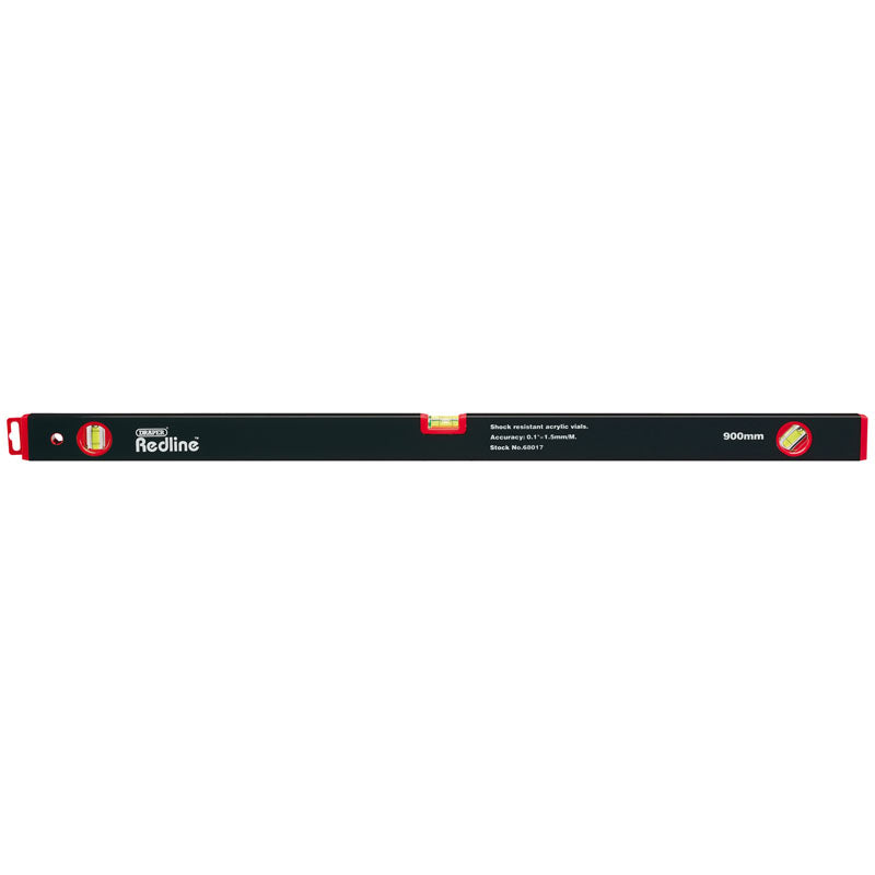 Aluminium box section level with horizontal, vertical and 45° vials. Accuracy 1mm per 1M = 0.057° in standard position (horizontal vial) and 1.5M = 0.1° (vertical and 45° vials). Display packed.