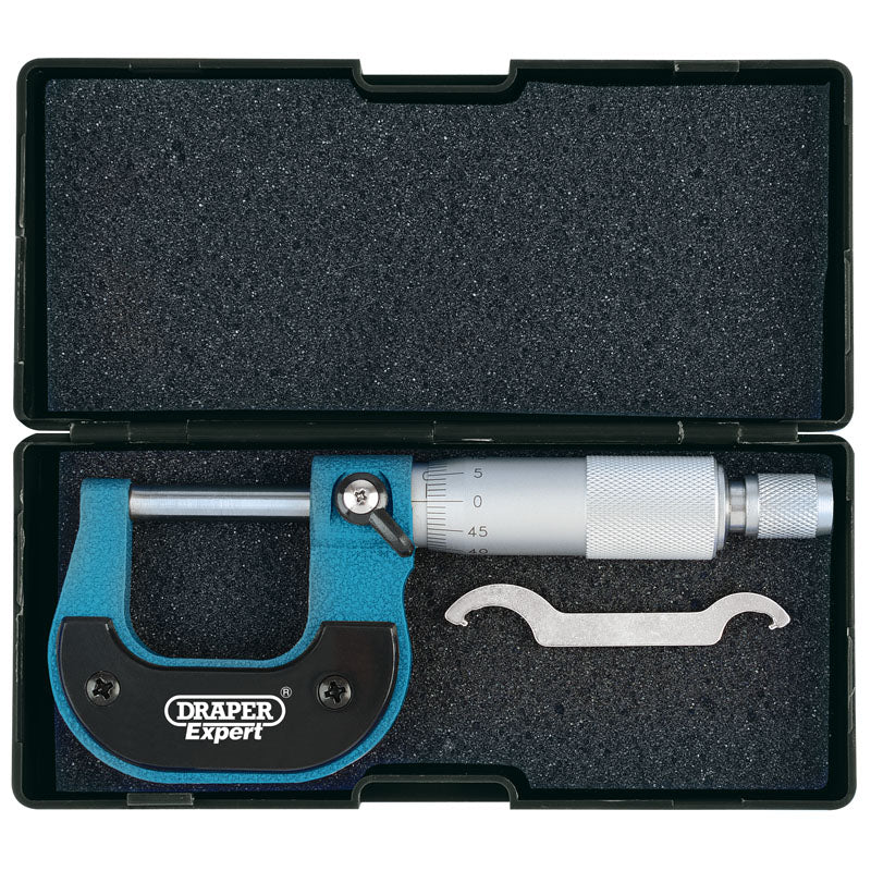 Expert Quality, with enamelled frame, heat plates, satin chrome thimble and sleeve. Graduations 0.01mm. Carbide tipped anvils, lock and ratchet stop. Supplied in plastic storage case and display packed.