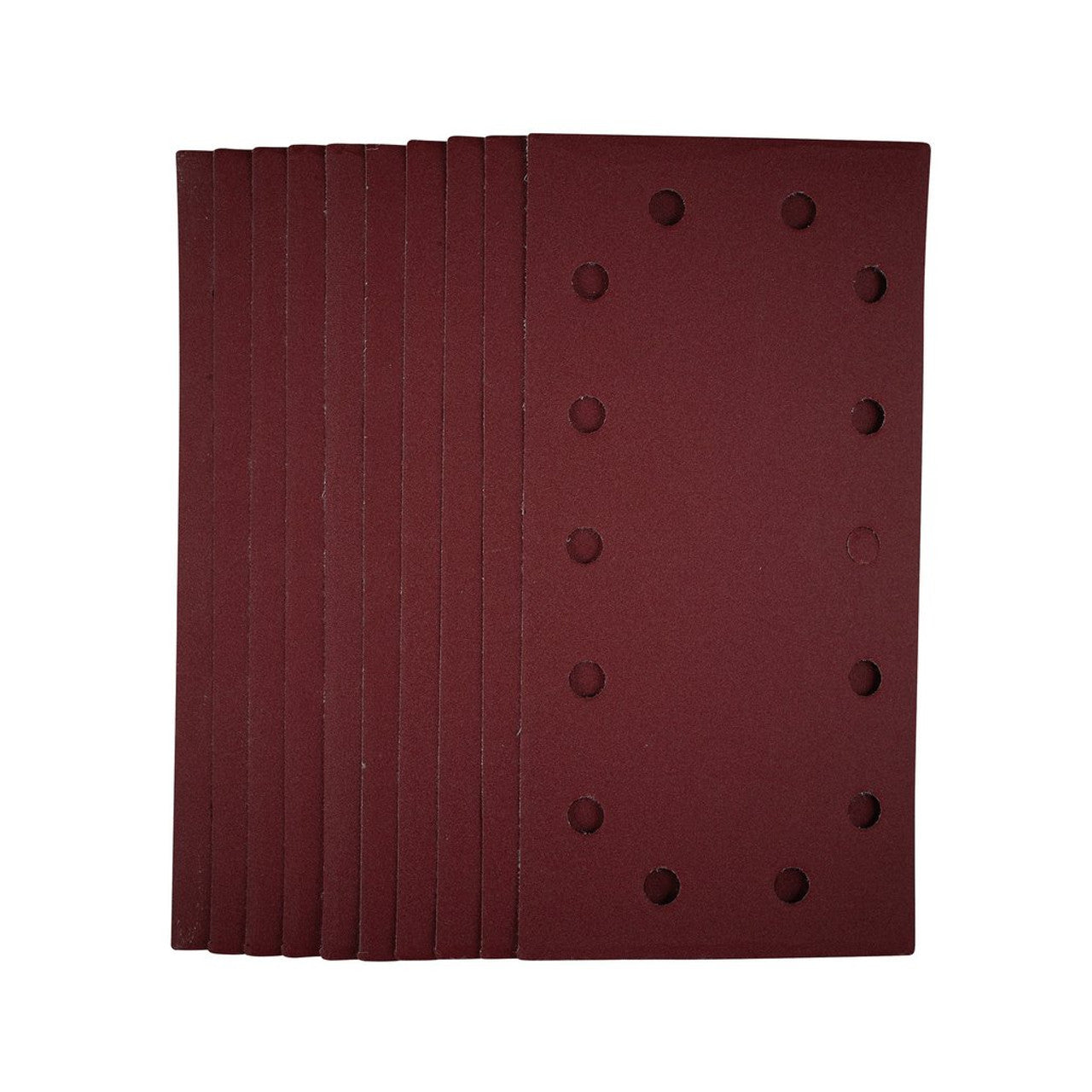 This pack of 1/2 sanding sheets (115 x 230mm) of 240 grit are made from premium quality aluminium oxide that is resin bonded to provide improved grain adhesion, anti-static qualities and long-lasting performance. The heavy duty E-Weight backing paper makes the sanding sheet more durable - able to withstand the toughest jobs. The hook and loop backing offers decent adhesion to facilitate the fast changing of sanding sheets. The 14 pre-punched 8mm holes improve dust extraction. Ideal for sanding and finishing wood, metal, aluminium alloy, painted surfaces, plastic and fillers. Compatible with most 1/2 sanders with hook and loop including Stock No. 57941.