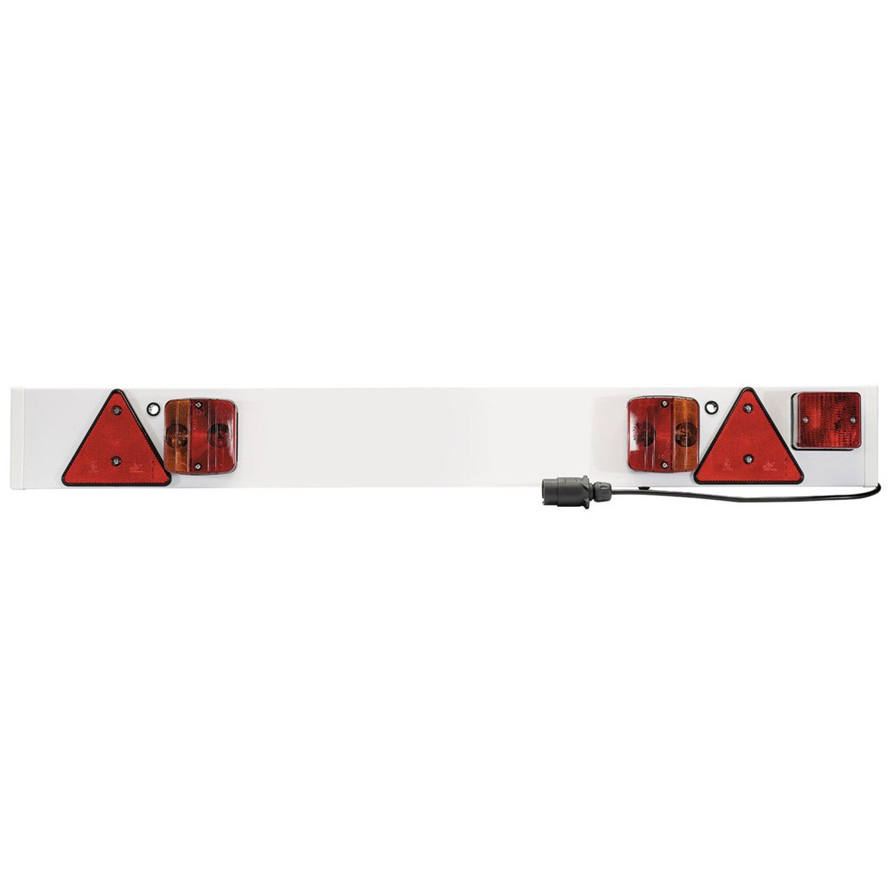 Standard 4'x6" composite trailer board with taillights/brake lights, indicators and number plate illumination. Also fitted with fog light and E-approved reflective triangles. There are two pre-drilled 12mm holes at each end for mounting. Fitted with P21W E4 single filament bulb and P21/5W E4 double filament bayonet bulb.