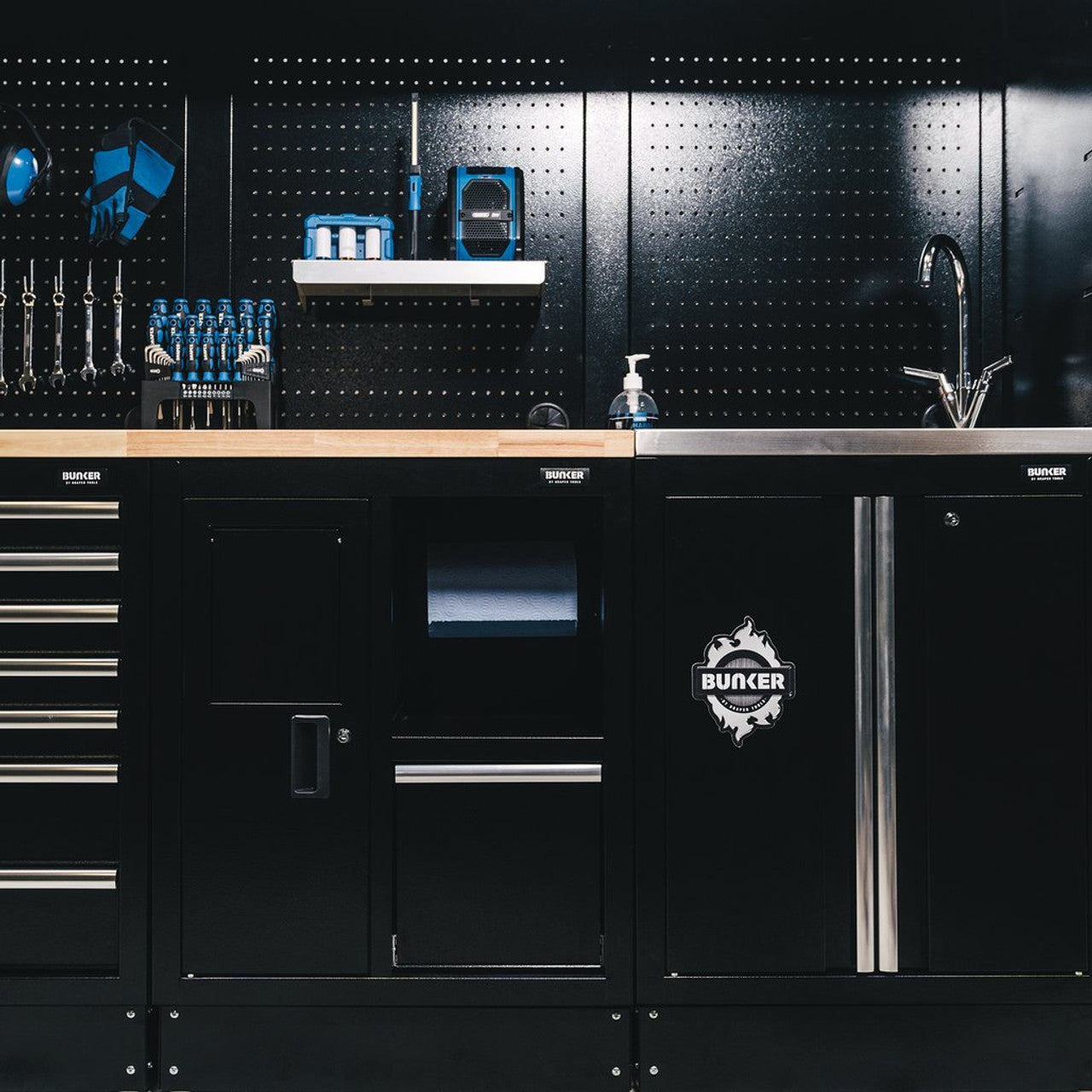 Part of the BUNKER® modular storage system. This stunningly designed premium-quality steel unit is fitted with a stainless steel sink, and two cupboard doors with aluminium handles, which provide access to the large storage space beneath it. The adjustable shelf inside allows for a more versatile use of space. The feet of the cabinet are adjustable for optimal positioning on an uneven floor. The cabinet’s matt black textured finish is highly durable, thanks to the industrial powder coating that protects against scratches, wear and corrosion. It has an integral lock for security and is supplied with two keys. The cabinet is delivered fully assembled and measures W 680 x H 948 x D 463mm. It can be used as an individual storage cabinet or as part of the BUNKER® modular storage system, which includes 24 clever modular options. It comes supplied with all the required fittings for simple installation. For your quality assurance, all BUNKER® units include a 10-year warranty.