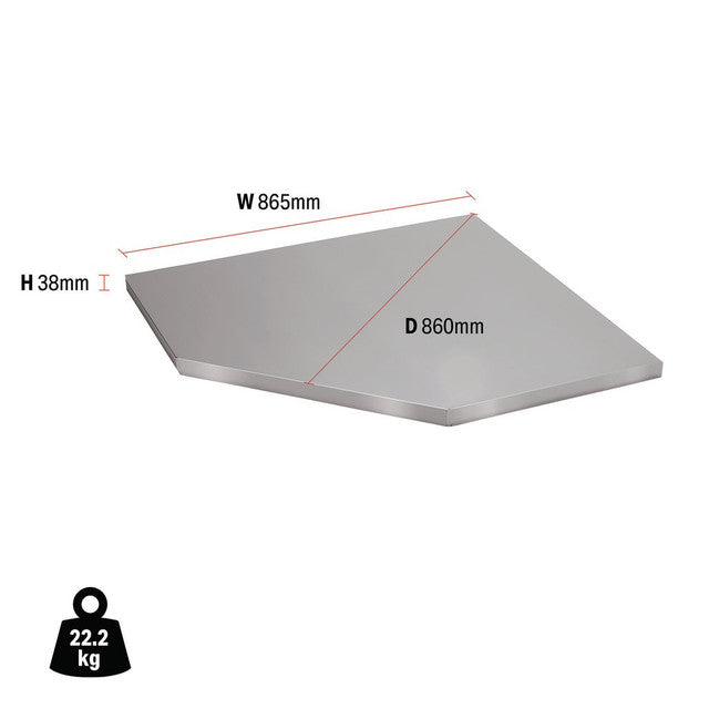 Part of the BUNKER® modular storage system. This stunningly designed premium-quality stainless steel worktop is for use with an 865mm-wide corner floor cabinet. It creates a stylish, practical and hardwearing work surface for all your needs, measuring W 865 x H 38 x D 860mm. This worktop can be used on one individual storage cabinet or as part of the BUNKER® modular storage system, which includes 24 clever modular options. It comes supplied with all the required fittings for simple installation. For your quality assurance, all BUNKER® units include a 10-year warranty.