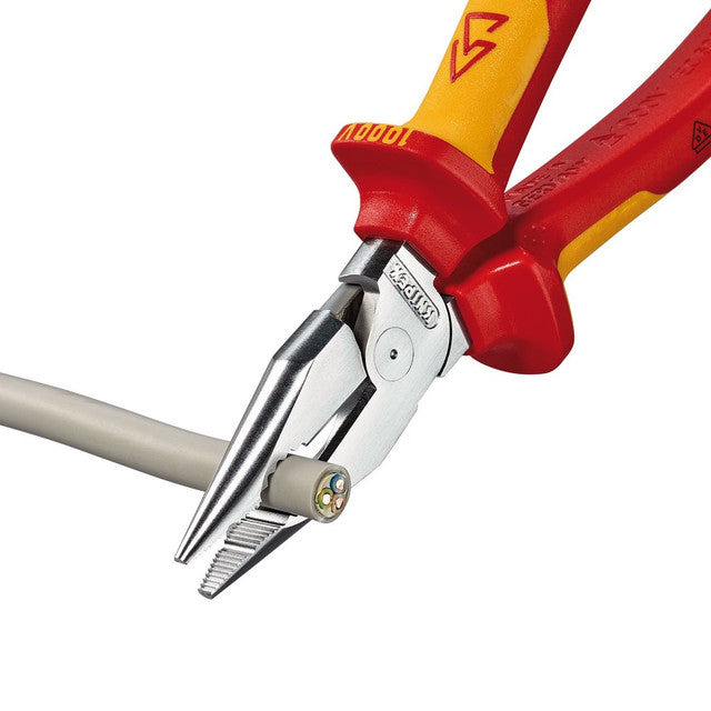 08 26 185 SB Needle-Nose Combination Pliers Powerful combination pliers with pointed jaws. For all common installation and repair work.. handy use when working in confined areas thanks to slim head design and pointed jaws (anti-twist). Milled groove in the gripping area permits small parts such as nails, pins and bolts to be held and pulled. The reliable and diverse combination pliers when out and about. Easy cutting thanks to the high leverage joint. With cutting edges for soft, medium-hard and hard wire. Long service life and stable tips. Cutting edges additionally induction-hardened, cutting edge hardness approx. 64 HRC. - Cutting capacities medium hard wire (diameter): Ø 3.8mm- Cutting capacities hard wire (diameter): Ø 3.0mm- Cutting capacity copper cable, multiple-stranded: Ø 13.0mm- Cutting capacity copper cable, multiple-stranded: 25.0mm²- VDE tested: yes