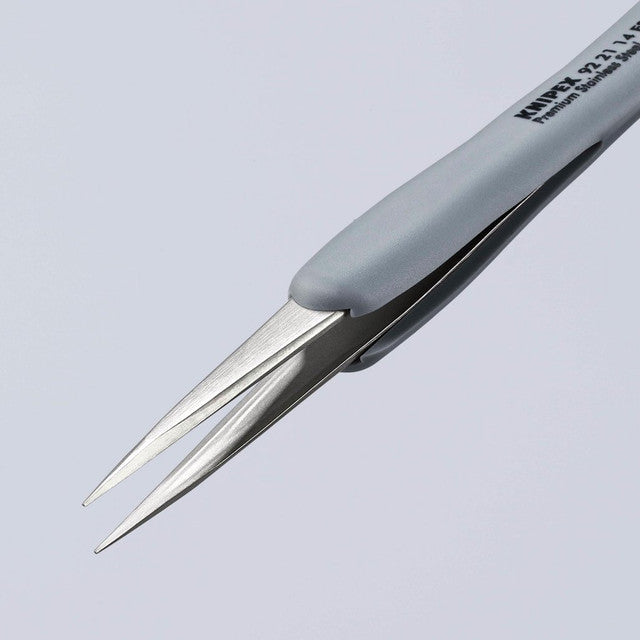 92 21 14 ESD Precision Tweezers with rubber handles ESD Electrically dissipative coating: Universal tweezers in the ESD version equalize differences in electrical potential between their user and the workpieces in a controlled manner. Maximum comfort for frequent use. Handles suitable for use in clean rooms and controlled environments. For medical technology, electronics, microscopy, industry. For particularly demanding precision work: tough and highly resistant to corrosion. Antimagnetic to avoid electromagnetic damage. ESD-tested, soft, and ergonomic handle sleeves with a surface resistance between 10^3 and 10^9 ohms. Extremely tough and very good corrosion resistance against a variety of atmospheric environments and many corrosive materials.