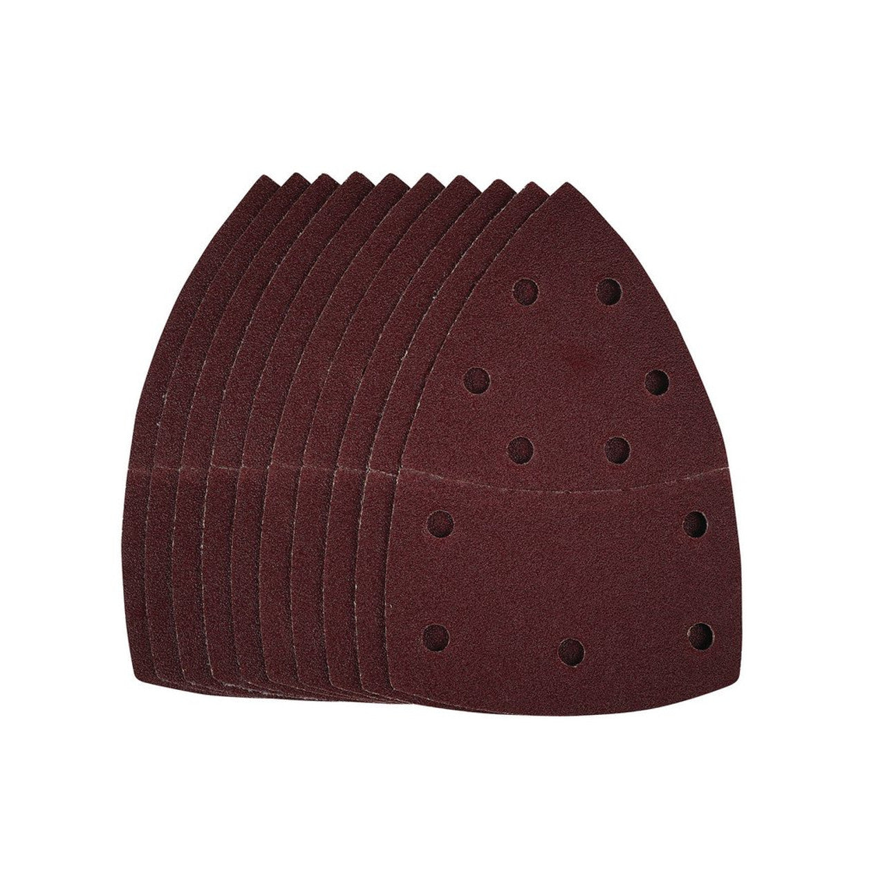 This pack of 10 multi-sanding sheets of 80 grit have a perforated tear off delta sheet for detail sanding (102 x 62mm, 93mm). They are made from aluminium oxide that is resin bonded to provide improved grain adhesion, anti-static qualities and long-lasting performance. The heavy duty E-Weight backing paper makes the sanding sheet more durable - able to withstand the toughest jobs. The hook and loop backing offers decent adhesion to facilitate the fast changing of sanding sheets. The 11 pre-punched 8mm holes help eliminate clogging and improve the dust extraction. Ideal for sanding and finishing wood, metal, aluminium alloy, painted surfaces, plastic and fillers. Compatible with most multi sanders with 102 x 62mm, 93mm hook and loop backing pads including Stock No. 57681.