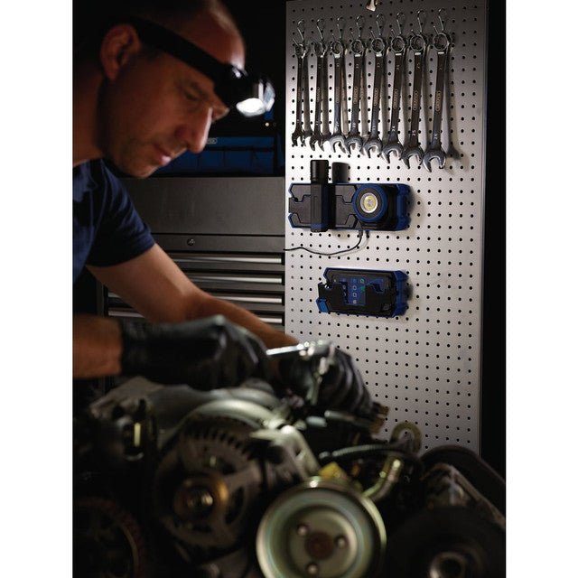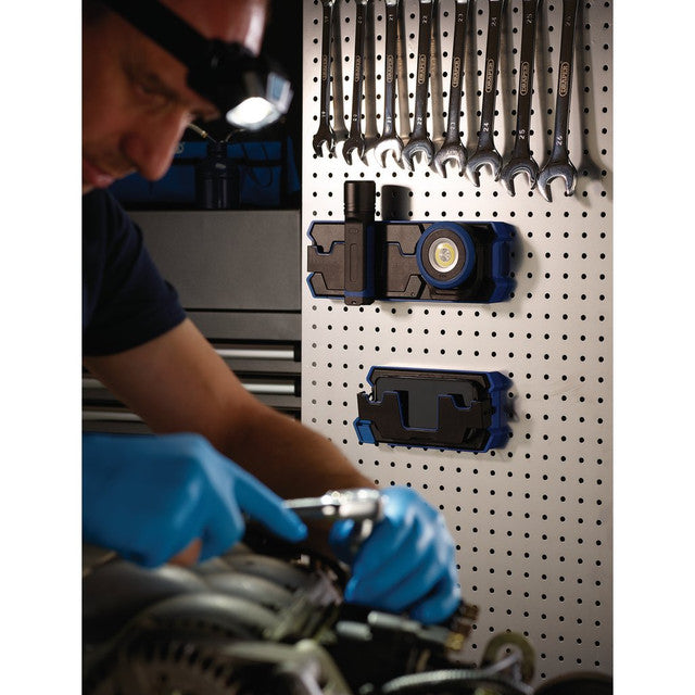 Fast wireless charging pad capable of charging one device at a time. Fitted with strong magnetic panels on the front and back to hold the device with a metal surface in place while charging. The LED charging indicator flashes green when charging. There is a pull-out phone holder suitable to hold QI enabled (wireless charging) smartphones up to 166 x 80 x 10mm in size. The charging pad is mountable to a non-metallic surface or wall using the two screw hole fixings (screws not supplied). IP20 rated. Compatible with the Draper range of wireless/USB rechargeable lights including Mini-Flood Light (Stock No. 65688), Head Torch (Stock No. 65689) and Hand Torch (Stock No. 65690) - sold separately. Supplied with USB-C charging cable and 3-pin UK plug.