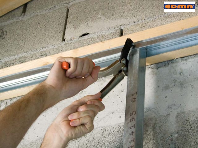 Ergotop Multiprofil Metal Frame Pliers for use in drywall installation. With a special application for right and left setting. Punch process. Universal stud crimping tool, able to work on both sides of the stud. No screws or anchors needed. Ergonomic design, special soft-grip handles. Replaceable punch.