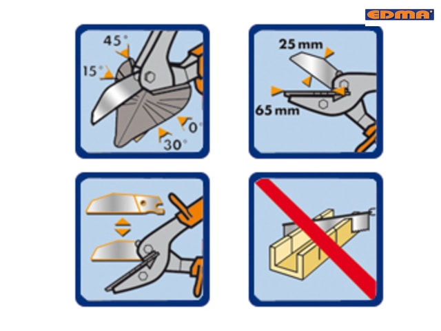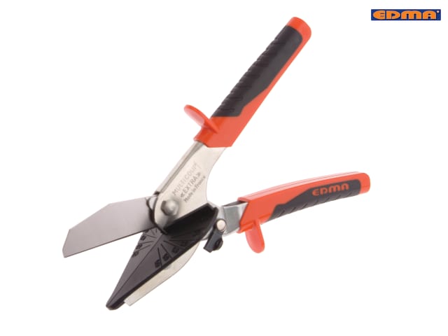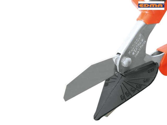 The Edma Multicoup Extra Universal Cutting Tool also known as mitre shears. With variable angle cuts. Eliminates the need for a mitre box. Fitted with ergonomic, soft grip handles for increased comfort. For use on decorative moulding, wooden skirting boards, rubber seals and PVC section.