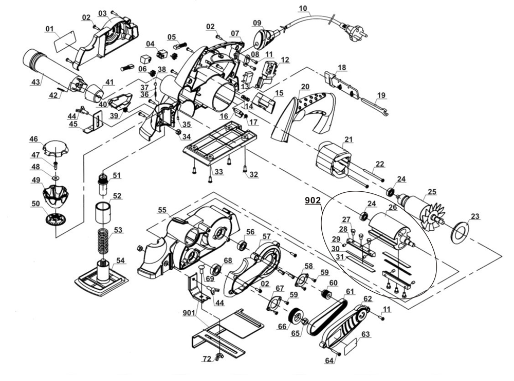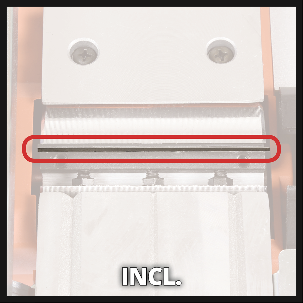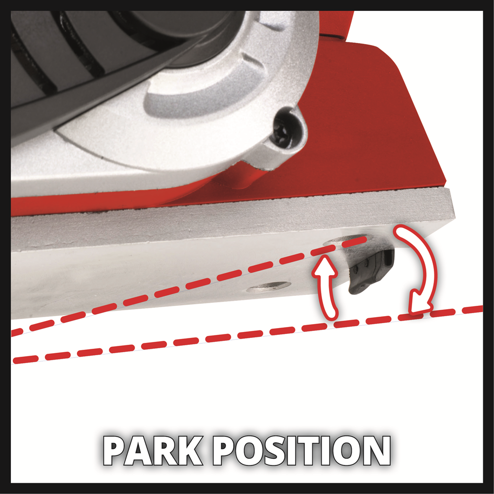 The Einhell planer TE-PL 900 is a powerful hand-held planer for applications with a chip depth up to 3 millimeters. A large knife shaft and 900 W power deliver optimum planing results. The chip ejector can be set to one of two sides and ensures flexibility when working, while the solid aluminium soleplates deliver flat results. In addition, the soleplate has three V-shaped grooves for easy chamfering of edges. The automatic parking rest protects both the workpieces and the planing knife. The ergonomic handle ensures a firm and secure hold for working without fatigue even on long work sessions, and the soft grip ensures comfortable handling. There is a cable clip to enable the cable to be easily secured when wound-up. The product is supplied with a parallel stop for straight and precise planing results, a rebate depth stop for making recesses with ease and a TCT planing knife (reversible knife) for a high surface quality.