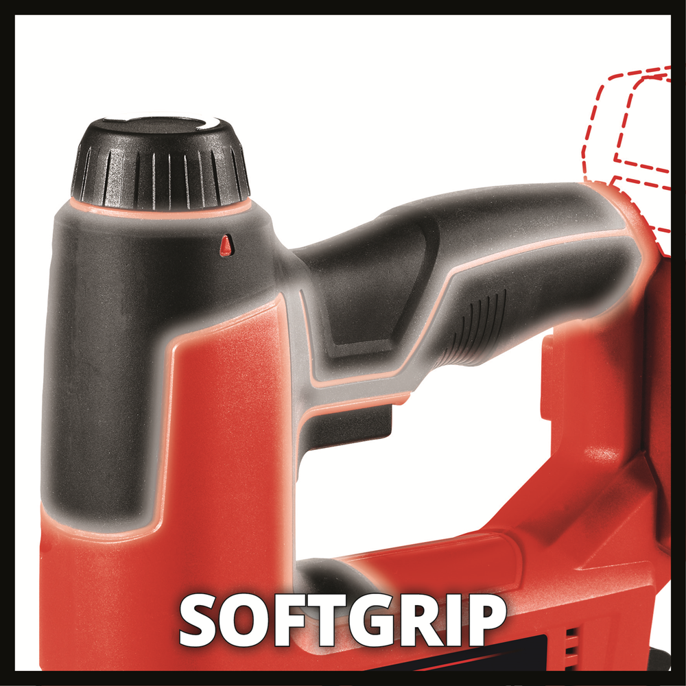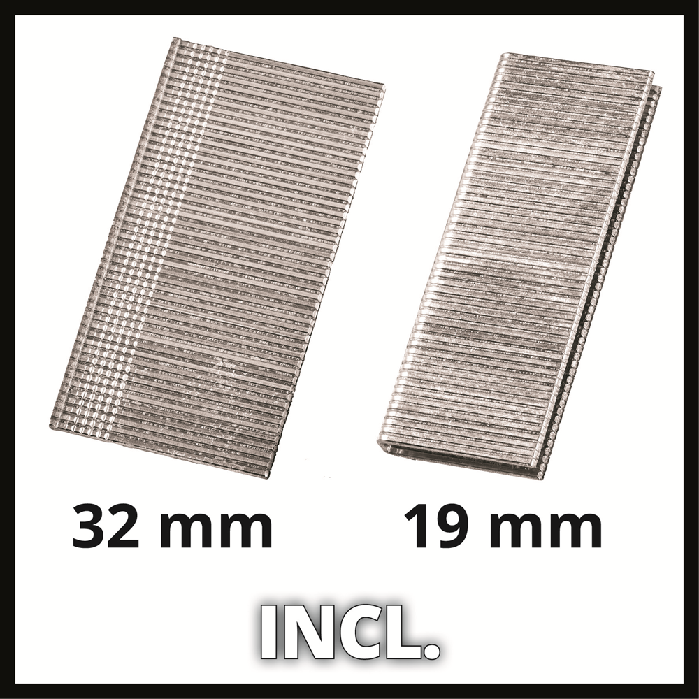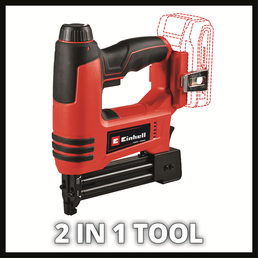 The cordless nailer TE-CN 18 Li-Solo is perfect for your garage or workshop and renovation work. Fixing objects with staples or nails is easy with stapler-nail gun combo. As a member of the Power X-Change family, the nailer can be operated with all batteries in the system series. The robust gearbox allows up to 20 impacts/min., while depth adjustment ensures variable impact depth. Working close to edges is possible thanks to the slim stapler nose. The magazine has a level indicator providing an overview of the current load and maximum capacity of 100 nails or clamps, all securely held by a magnet. It can be easily opened and refilled at the push of a button. The pressure mechanism on the stapler nose allows safe working, while large softgrip surfaces offer comfortable and firm hold. Delivery includes practical belt clip for safe storage and 300 nails (32mm) + 300 staples (19mm). With the supplied hexagon key, nail/staple jams can be easily and quickly fixed. Release protection prevents unintentional tacking/nailing, preventing injury. Batteries and chargers in the Power X-Change series are available separately, for example as a practical starter kit.