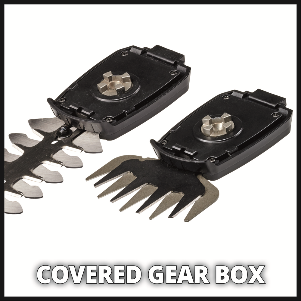 The Einhell GE-CG 18/100 Li-Solo cordless grass and shrub shears is a high-performance member of the clever Power X-Change family. The cordless tool is a convenient alternative to hand-operated pruning saws or garden shears. It is also lighter, quieter and more versatile than the petrol-powered or electronic versions and is therefore an ideal helper when it comes to pruning, shaping and thinning out shrubs and trees. The grass cutting blade is perfectly suited for cutting lawn edges (100 mm). The laser-cut and diamond-ground shrub shears blades are ideally suited for trimming hedges and bushes. The tools are easy to change over without the need for any other tools. The soft grip provides a perfect grip and ergonomics for every movement during use. The covered gearing housing provides protection during use and when cleaning against contact with parts which are lubricated with gear oil. One 18 V PXC battery is needed for operation. The battery and charger are not included in the scope of this delivery they are available separately.