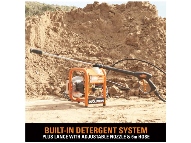 The Evolution PW3200 Evo-System Pressure Washer has been designed to use with the Evo-System EVO200 Engine. It has a robust, potable design that is protected by a sturdy steel frame, which also enhances the pump's portability. Features a premium quality, brass pump for high-pressure performance (175 bar) and built-in detergent system for maximum cleaning capability.