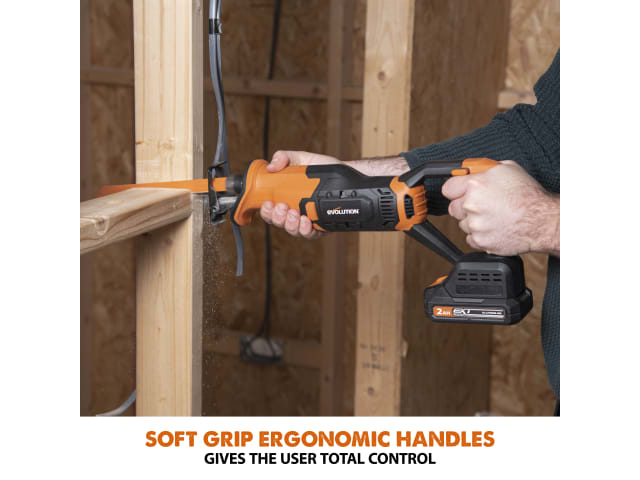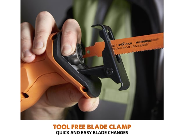 The Evolution R150RCP-Li EXT Reciprocating Saw features a variable speed trigger for intuitive speed changes and a safety lock-off switch to prevent accidental starts. A large soft-grip front handle and ergonomic soft-grip trigger handle allow for maximum control of the tool. Blade changes are made easy with the tool-free blade clamp. Simply twist the clamp collar to release the blade.