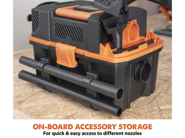 The power take-off socket provides effective dust collection, it automatically starts when attached to a power tool. It has a compact design and carry handle, making it easy to transport between jobs. With onboard accessory storage for quick access to nozzles and a handy cable tidy.