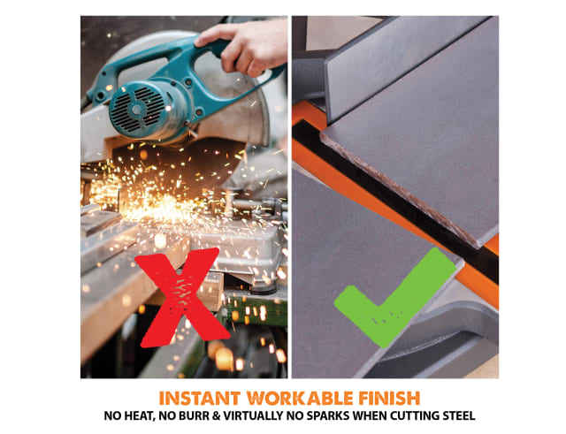 The Evolution R210CMS Multi-Purpose Compound Mitre Saw is safer, faster and more economical than abrasive metal cutting saws. When cutting mild steel the saw produces no heat, no burrs and virtually no sparks. The cuts are clean and cool to touch, creating an instant workable finish.