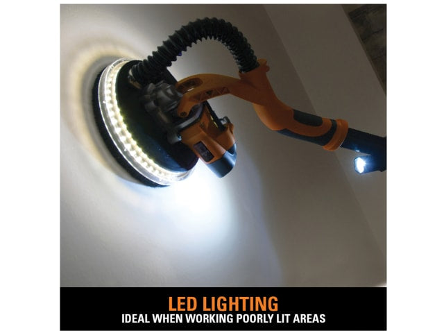 Other features include soft grips on the main handle and bail handle for effective control and perfect weight balance. This dry wall sander is equipped with LED lighting allowing you to see any shadows created by unsmooth areas, when lighting is insufficient.