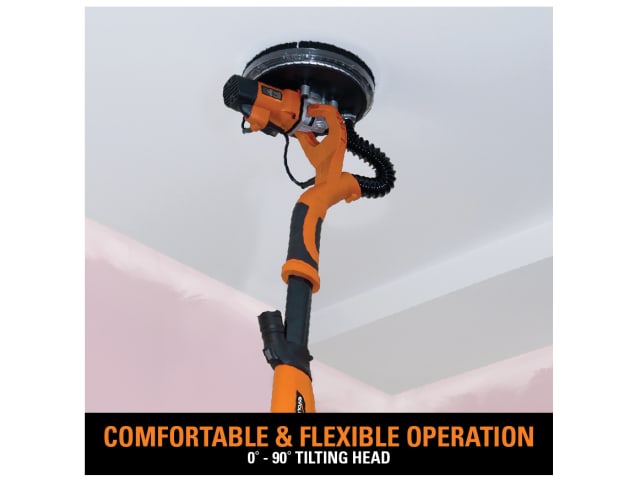 It is comfortable and flexible in operation, with a 0-90° pivoting head, ensuring you follow the contours of the work surface, in any direction. The telescopic design extends this lightweight dry wall sander to 1.97 metres in length, making it easy to sand those hard to reach areas comfortably.