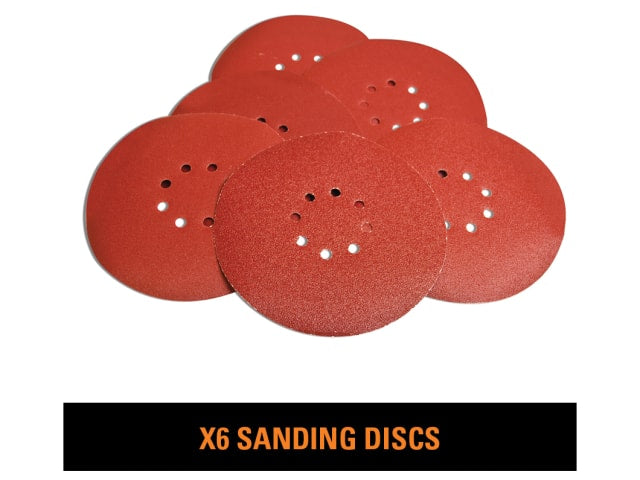 Supplied with: 6 x 225mm Sanding Discs (One of each: 60, 80, 120, 150, 180 & 240 Grit). and 1 x 4m Vacuum Hose.