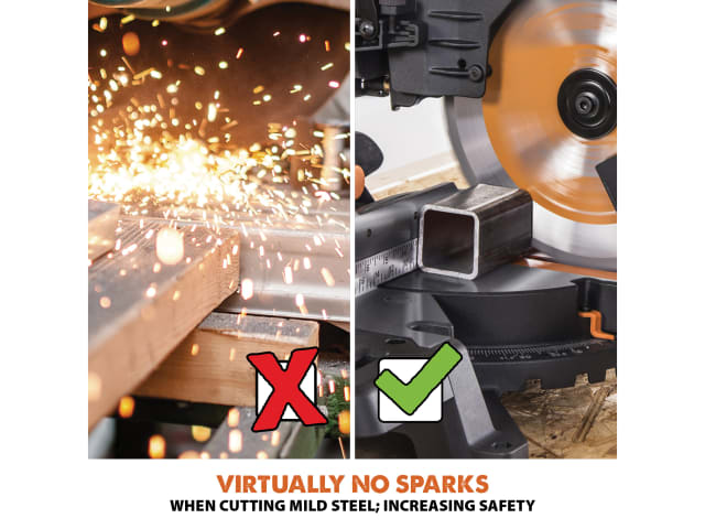 The Evolution R255SMS-DB+ Multi-Material Sliding Mitre Saw is ideal for on-site use and can cut a variety of materials such as wood, mild steel, wood even with embedded nails, aluminium, plastic, copper and more, thanks to the 28 tooth TCT blade and optimised gearbox and motor speed. When cutting mild steel, the saw produces a square, ready-to-weld cut with no heat, no burrs and virtually no sparks, far superior to abrasive cutting methods.