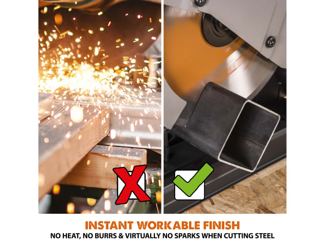 The Evolution R355CPS Multi-Material Chop Saw uses patented Evolution multi-material cutting technology, optimised to cut wood, mild steel, non-ferrous metals, wood with embedded nails and plastic with a single blade. The superiority over abrasive methods are indisputable, leaves a ready-to-weld, accurate, clean and square cold cut with no harmful smoke, no hot sparks or burrs, leaving an instantly workable finish.