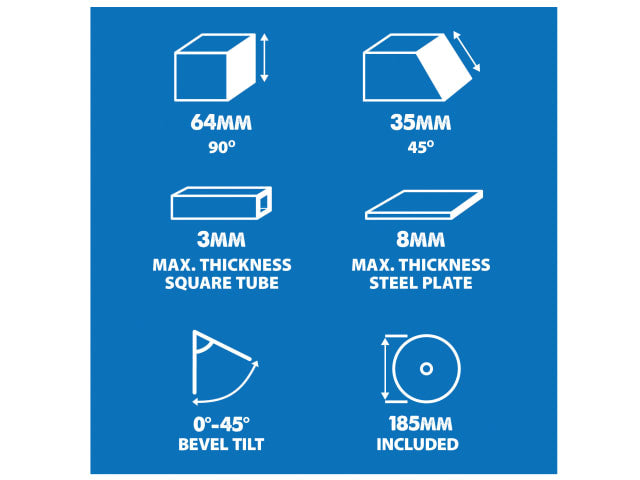 Supplied with: 1 x 185mm Mild Steel TCT Blade, 1 x Parallel Edge Guide, 1 x Hex Key and 1 x Instruction Manual.