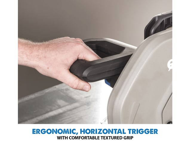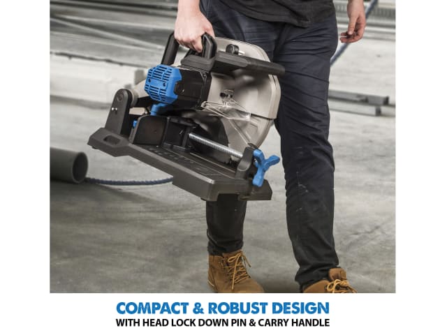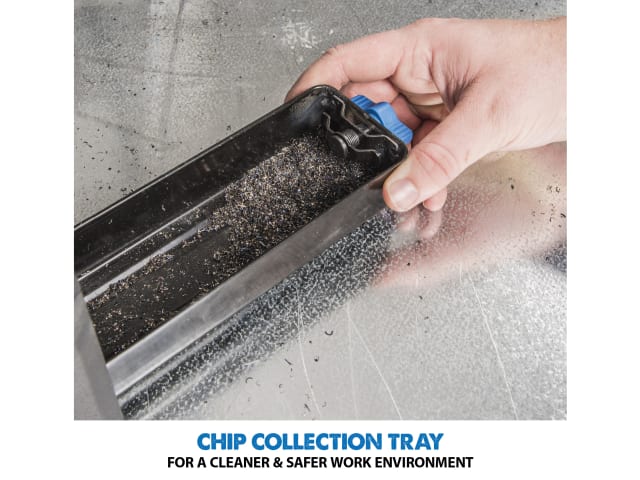 The high-speed carbide-tipped blade gives you a finished product with a straight, clean edge. Fast action swivel vice enables cuts to be made from 0-45°. A hi-torque gearbox reduces motor load and improves performance, and a pull-out collection tray makes it easy to dispose of metal chips.