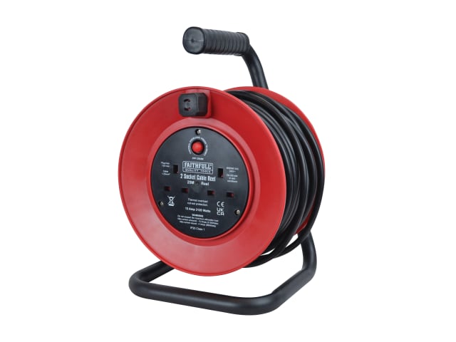 Faithfull Open Drum Cable Reel with twin 240V sockets. The 1.25mm² cable is fitted with a standard 240V plug. For added safety, the reel is fitted with a thermal overload protection system to prevent overheating damaging the cable when in use. The heavy-duty plastic drum is mounted on a sturdy steel frame with a textured grip for user comfort. Complies to BS EN 61242.
