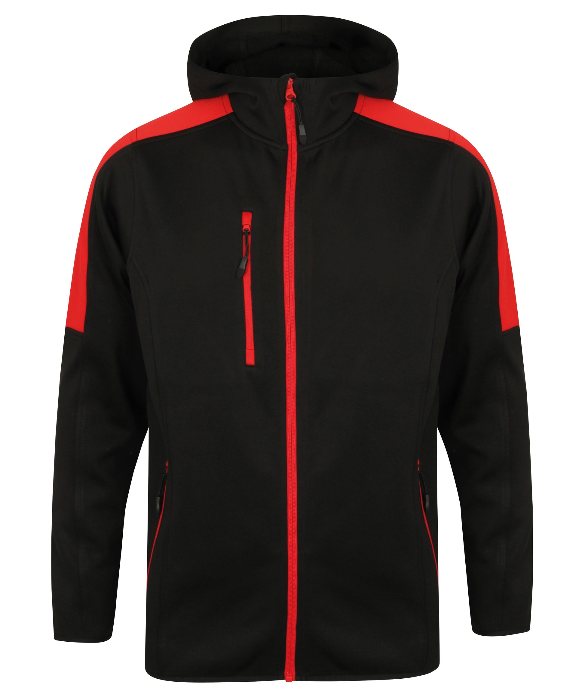 Contemporary softshell jacket with 3 piece hood. Contrast colour panelling on shoulders and upper sleeve. Soft-touch Jersey fabric with bonded microfleece reverse. Zipped chest and side pockets and contrast colour centre front zip with non-slip gripper zip pulls. Side body panels with topstitching. Dropped back hem. Stretch binding at cuffs and hem. Set-in sleeves. BSCI certified.