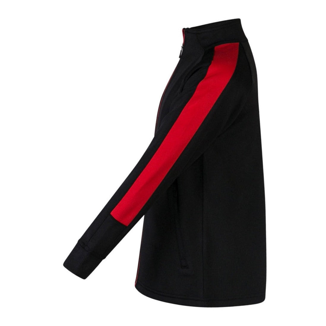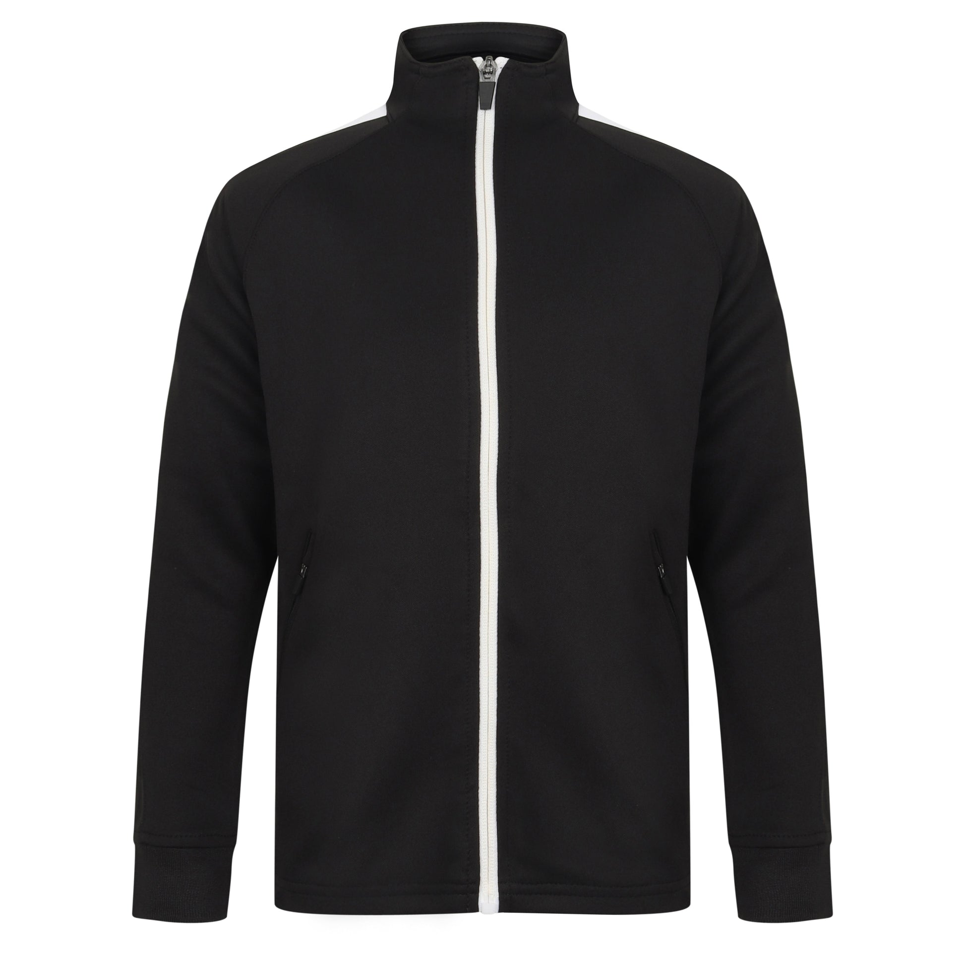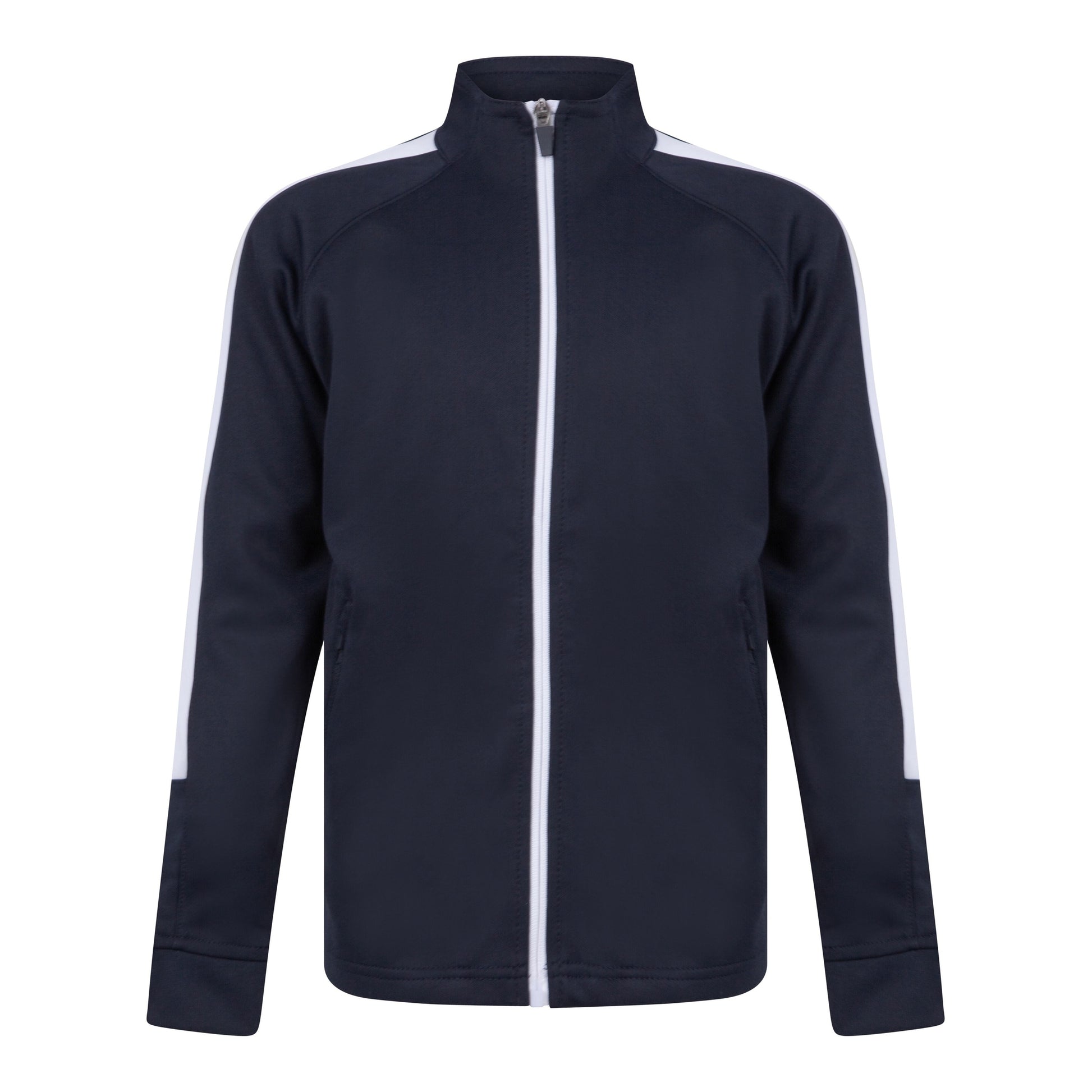 Knitted tracksuit top with contrast colour panels on outer sleeve. Contrast colour centre front zip. Zipped side pockets. Funnel neck and 1x1 ribbed cuffs. Semi-automatic lock zip sliders on all zips. BSCI certified.