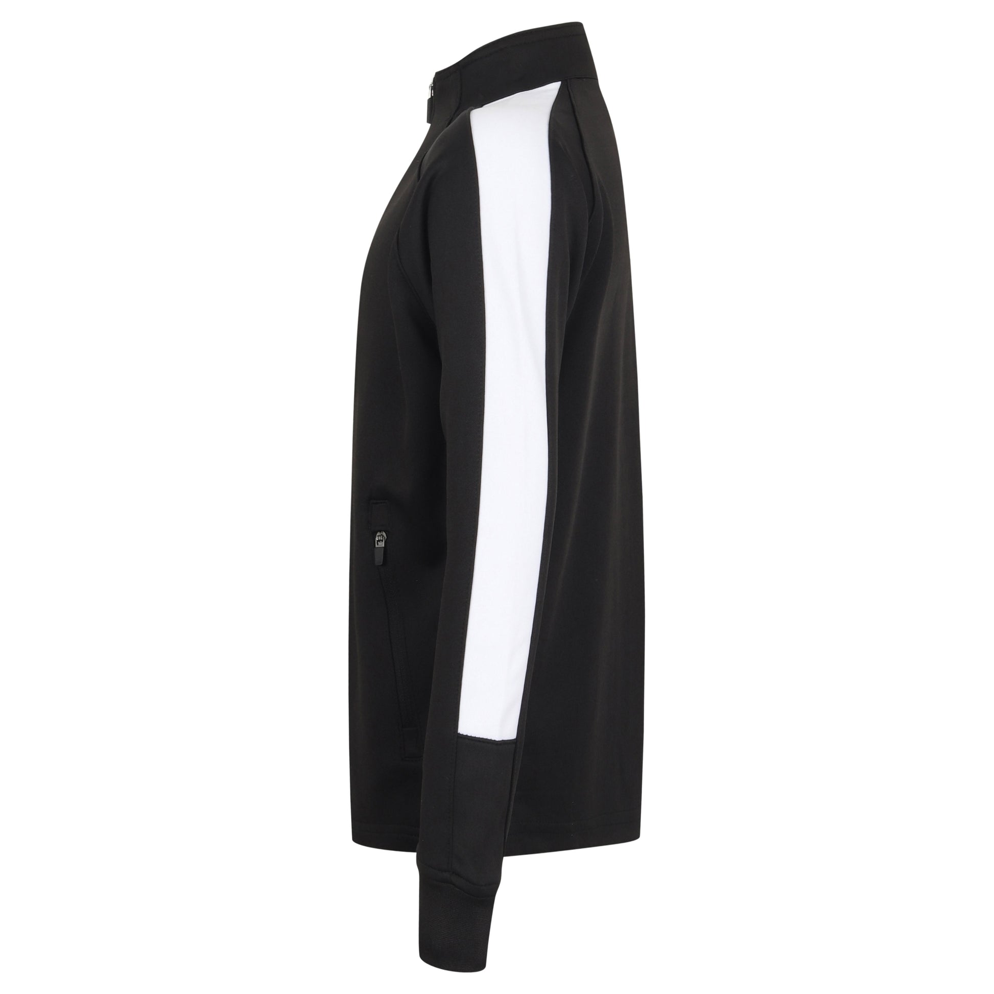 Knitted tracksuit top with contrast colour panels on outer sleeve. Contrast colour centre front zip. Zipped side pockets. Funnel neck and 1x1 ribbed cuffs. Semi-automatic lock zip sliders on all zips. BSCI certified.