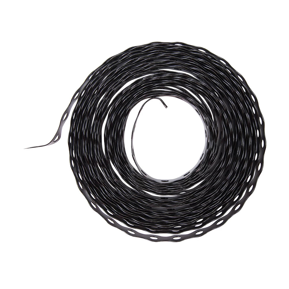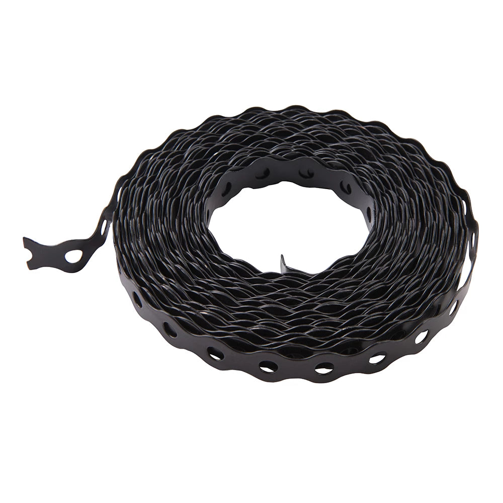 Versatile, strong strapping made from black, plastic-coated galvanised steel. Easy to bend or twist to fit many industrial and DIY applications. Pre-perforated fix using nails, bolts or screws. Can be cut, bent and formed for types of light fixing applications. Use for securing, supporting and strapping of cable, trunking and ducting. Not recommended for structural applications.