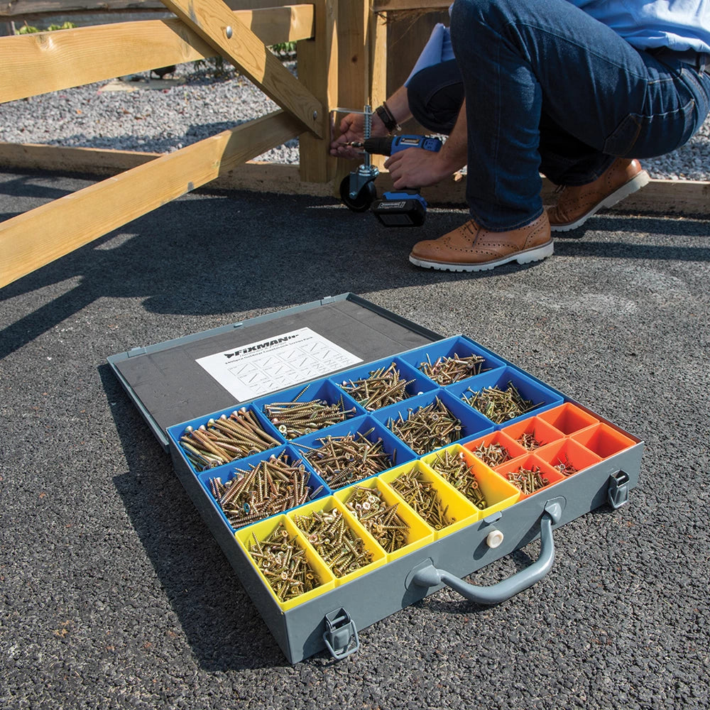 100 x Goldstar countersink 6 x 100mm 100 x Goldstar countersink 5 x 80mm 100 x Goldstar countersink 5 x 70mm 100 x Goldstar countersink 5 x 60mm 200 x Goldstar countersink 5 x 50mm 200 x Goldstar countersink 5 x 30mm 200 x Goldstar countersink 4 x 50mm 200 x Goldstar countersink 4 x 45mm 200 x Goldstar countersink 4 x 40mm 200 x Goldstar countersink 4 x 30mm 200 x Goldstar countersink 4 x 25mm 200 x Goldstar countersink 4 x 20mm 200 x Goldstar countersink 3.5 x 40mm 200 x Goldstar countersink 3.5 x 30mm 200 x Goldstar countersink 3.5 x 25mm 200 x Goldstar countersink 3.5 x 20mm 200 x Goldstar countersink 3.5 x 16mm 200 x Goldstar countersink 3.5 x 12mm 200 x Goldstar countersink 3 x 12mm 1 x Metal carry case with plastic compartment dividers |