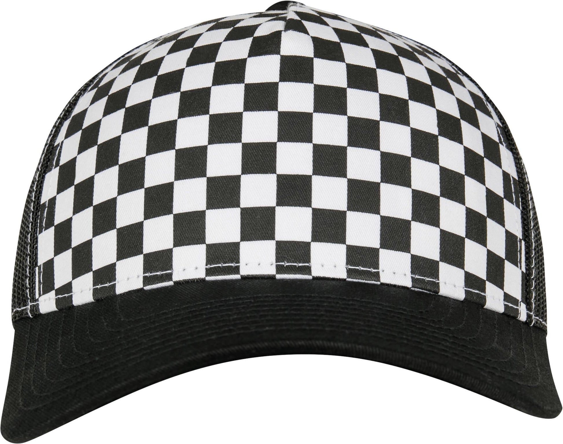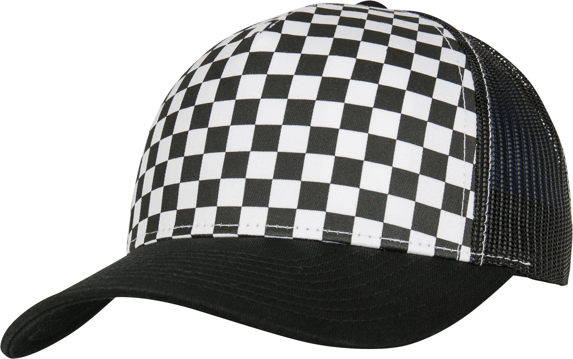 Checkerboard retro trucker cap. Hip checkerboard pattern. Checkerboard print on the front, airy mesh on the back. Integrated snapback closure for easy size adjustment. BSCI certified. WRAP certified.