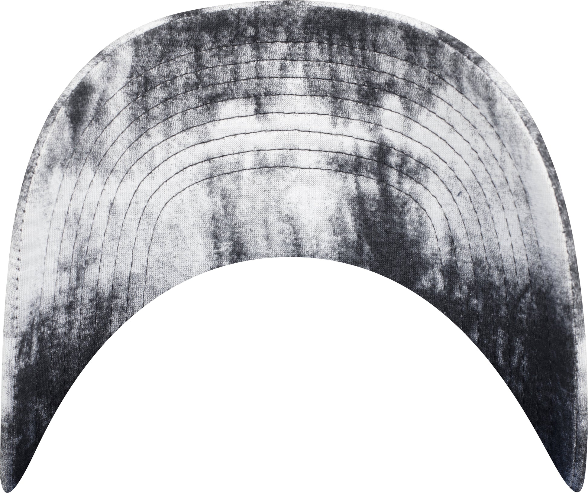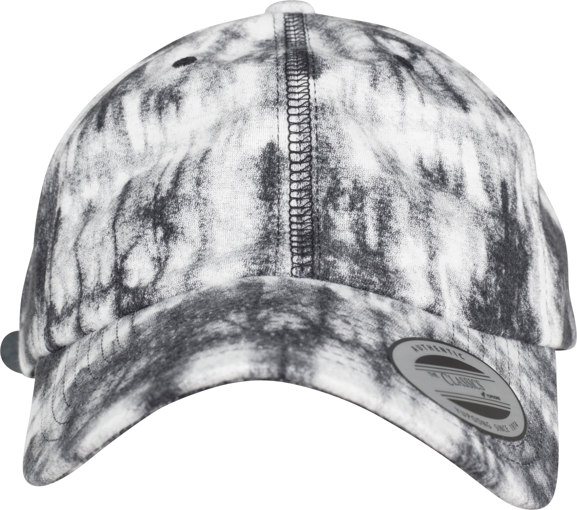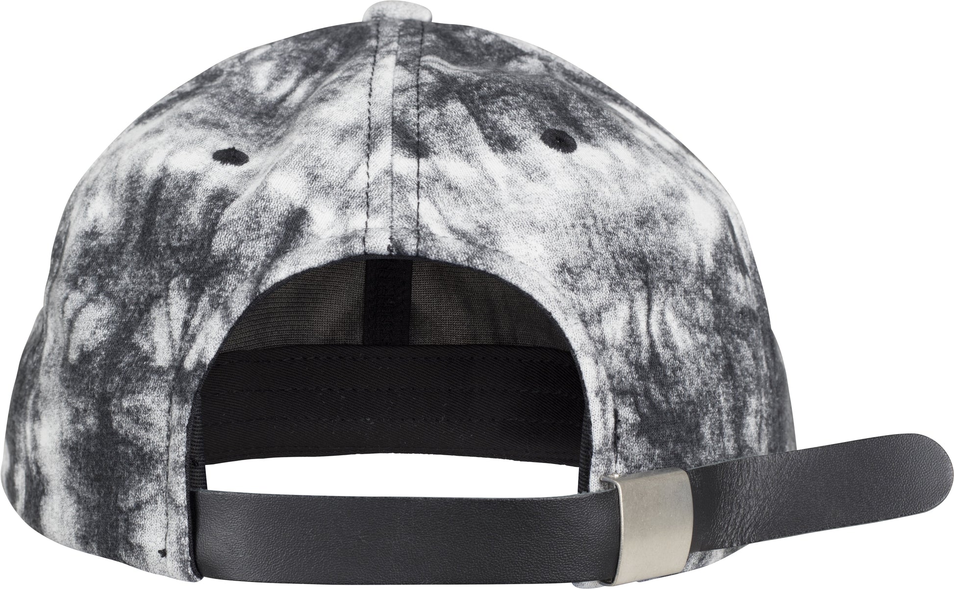 Low-profile tie-dye cap. Subtle black-and-white batik wash. Casual dad cap shape. Genuine leather strap with metal buckle. BSCI certified. WRAP certified.