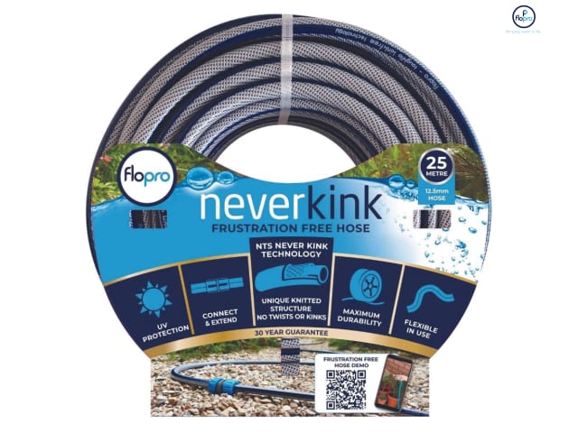The Flopro Never Kink Hose is a premium quality hose with kink-free technology. Its patented NTS inner knitted mesh layer will absorb any twists and kinks, giving you a frustration-free hosepipe. Made from 25% recycled PVC, this hose also offers maximum durability with its dual outer layer to protect from UV rays for longer life. It also has an anti-cut and abrasion surface for the smooth handling of all your watering jobs.