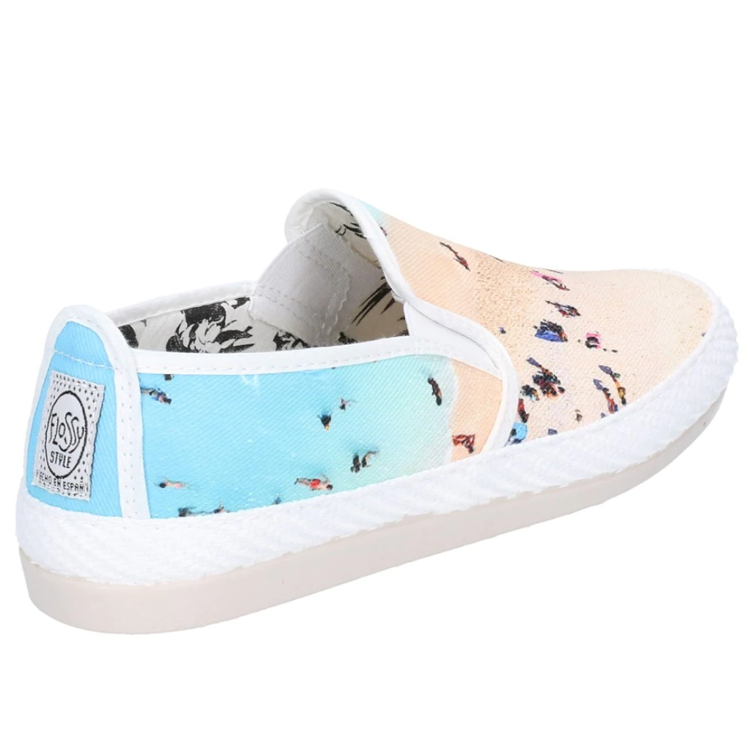 Flossy summer print Riviera style slip on espadrille with elasticated fitting and Mediterranean jute rope wrap.