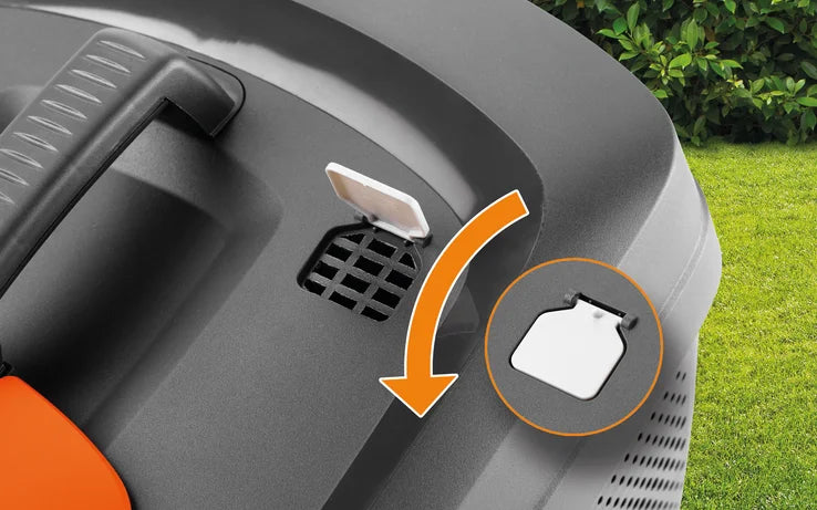 Easy 3 step storage for saving floor space. Fold the handles, stand it up vertically and hang the grass box.