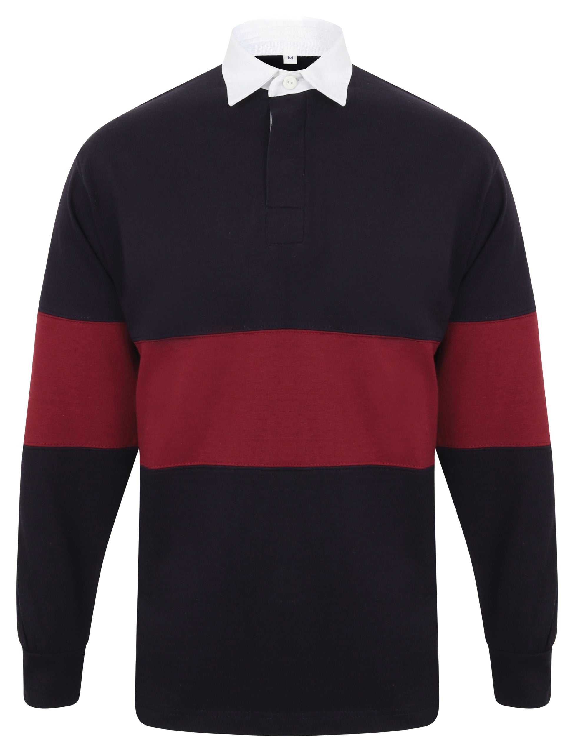 Tag free retro fit rugby shirt. Cut and sew contrast stripe panel around centre. Heavyweight single Jersey. Contrast traditional woven (twill) rugby collar. Herringbone back neck tape. Contrast herringbone taped side vents. Taped shoulders. Elastane reinforced ribbed cuffs for shape retention. Twin-needle hem. Topstitching at armholes and panels. Concealed button placket. Herringbone inner placket. 2 x rubber buttons. WRAP certified.