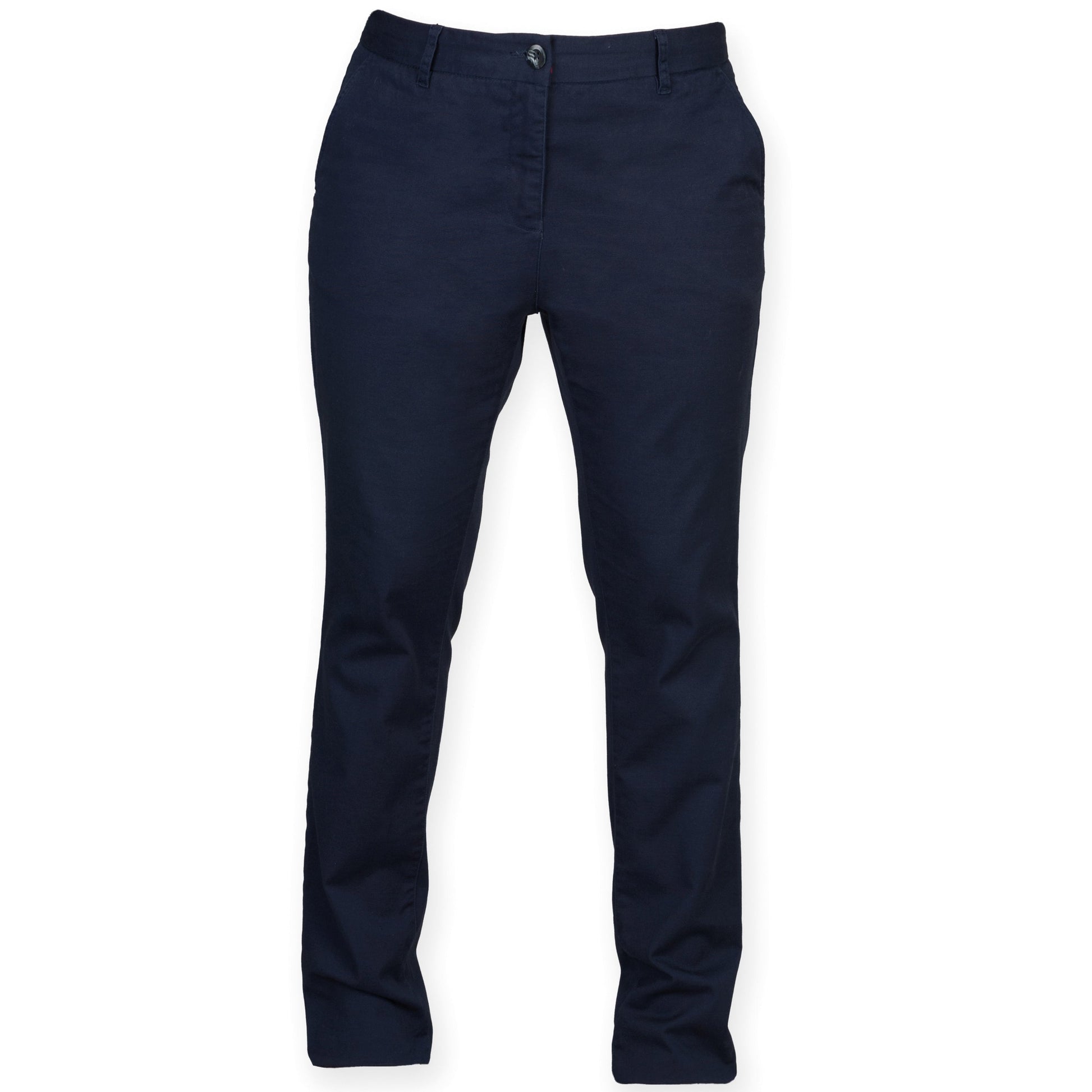Flat front chino trouser. Tag free. Stretch fabric for ease of movement. Slanted front pockets, 2 back welt pockets, belt loops plain hem. BSCI certified.