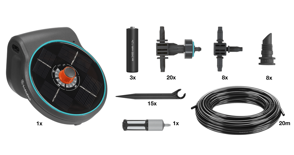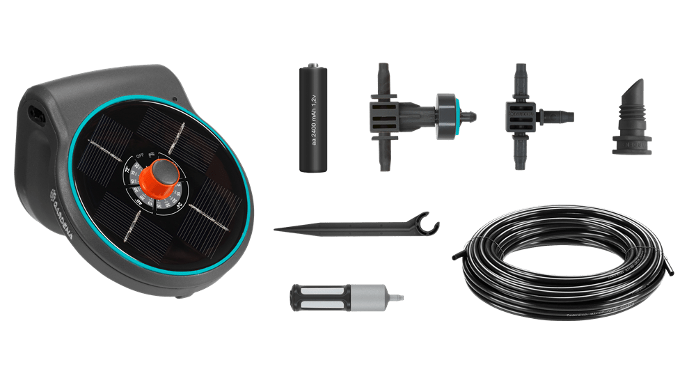Plant care for when you’re not there. With GARDENA AquaBloom your balcony and tub plants are in good hands - all season long. AquaBloom waters and takes care of your plants even in times when you're not around. The helpful system requires neither a water tap nor a power supply in your garden or terrace. With just an additional water bucket you’ll be ready to go. The AquaBloom set is a complete ready-to-use irrigation system consisting of a 3-in-1-main unit. It combines a pump to draw water, a control unit to define the irrigation schedule and a solar panel that feeds the included rechargeable batteries. The 14 pre-defined watering programs let you still be in control of the watering of up to 20 plants with the help of pressure-compensation drippers. Each dripper can cater up to 300 ml. Don’t forget to make use of the very convenient and flexible placement of the AquaBloom. Choose a sunny place for the control unit: hang it on a flowerpot, place it on a table or fix it on a wall. The installation of AquaBloom is simple and tool-free!