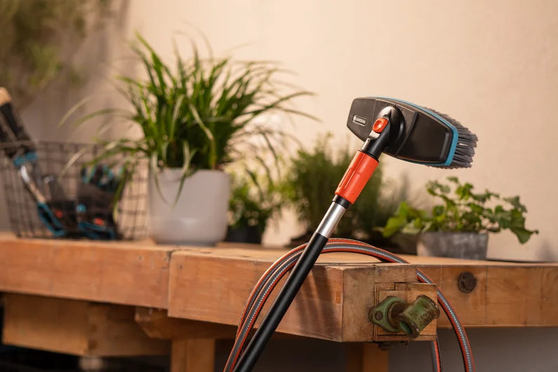Sparkling clean and gentle, the GARDENA Cleansystem Hand Brush Soft is designed for thorough yet delicate cleaning of larger outdoor surfaces such as conservatory roofs, greenhouses, or garden furniture. Connected directly to a garden hose via the compatible Cleansystem Handle, the brush delivers a consistent water flow for efficient cleaning. The soft bristles ensure surfaces remain undamaged, while the rotatable brush head—adjustable in 30° steps—makes it easy to reach awkward or high-up areas. The soft plastic edging around the head provides additional protection, preventing scratch marks during use. Made in Germany using high-quality, durable materials, this handled brush is ideal for sensitive surfaces and offers long-lasting performance. For optimal results, it can be paired with Cleansystem Handles (Art. 18000, 18002, 18804) and GARDENA Cleaning Tabs (Art. 18818). GARDENA offers a 5-year warranty upon registration within 3 months of purchase at gardena.com/registration.