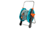 Telescopic handle and special folding mechanism provide for space-saving storage. Swivel axle prevents the connecting hose from turning when winding the main hose on or off.