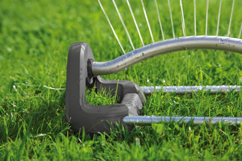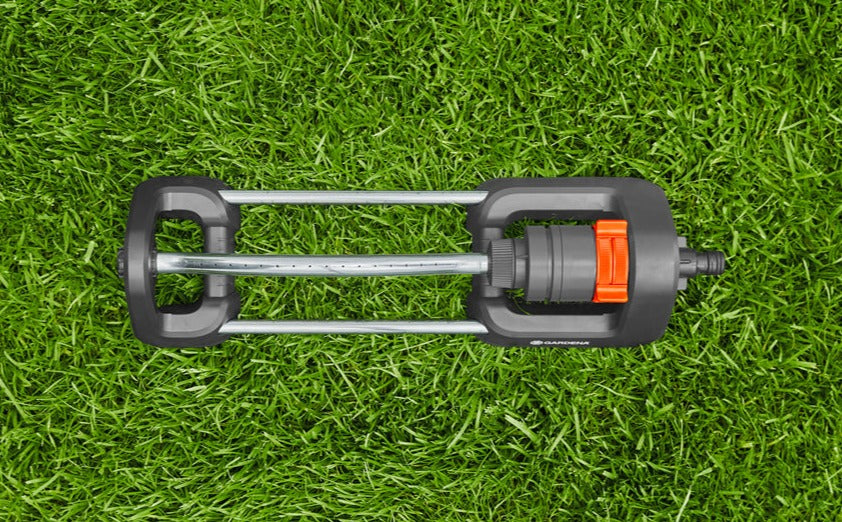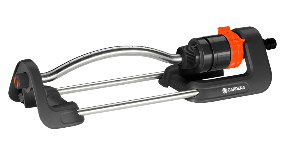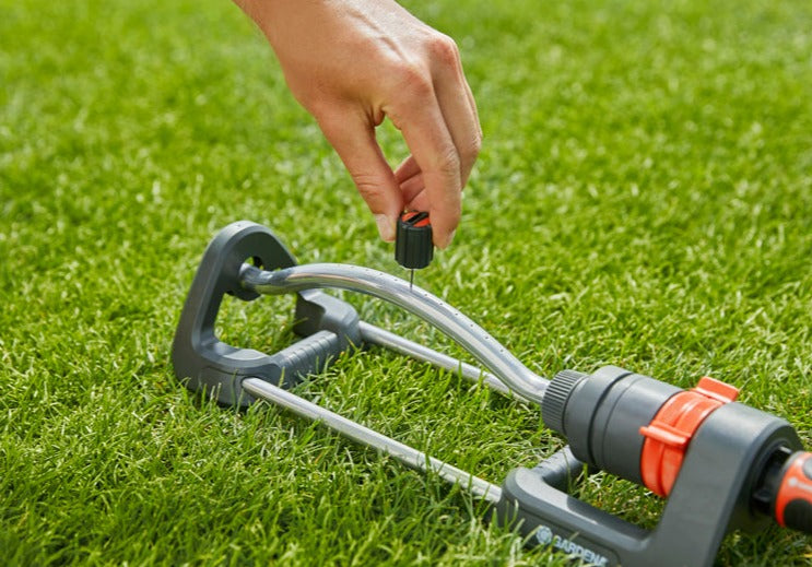 Enjoy every inch of summer – with the Aqua S oscillating sprinkler from GARDENA. The sprinkler ensures that your lawn and plants are evenly and precisely watered without forming puddles. The Aqua S is designed for areas of 90 to 220 m² and can be set up in the blink of an eye. Just place it on the lawn and set the range anywhere between 7 and 17 metres using the slider. The width range of the Aqua S is max. 13 metres. Once the hose is connected, you can turn on the water and your plants will be reliably watered. It’s not just good for the plants, it also allows you to spend more time on other things. The durable material with metal components ensures that the sprinkler remains firmly on the ground. It is also worth noting that the Aqua S is protected against frost as well as UV radiation, meaning that it doesn’t always need to be removed from the lawn after use. The 5-year manufacturer’s guarantee further highlights its top-quality, together with the Made in Germany-seal. Cleaning the Aqua S is as simple as setting it up. The water connection has a built-in metal filter, which can be taken out easily by rotating the connection. Then, hold it under running water to clean it off. If limescale builds up on the nozzles, use the needle provided: it's at the end of the sprinkler in a screw cap. Use it to poke the holes and unclog the nozzles.