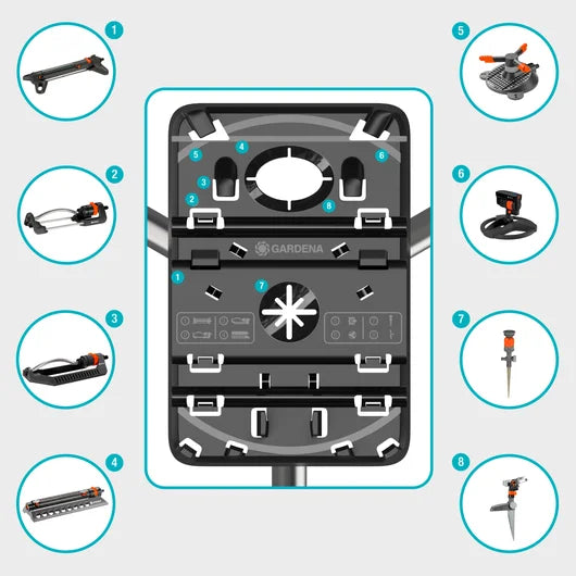 - Setup with a click – Various GARDENA sprinklers can be easily attached to the stand.