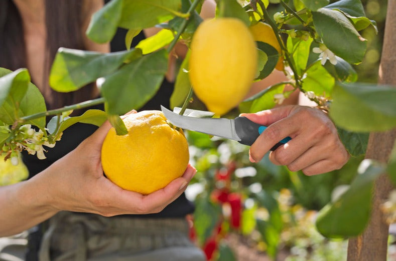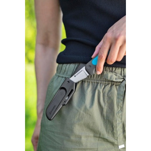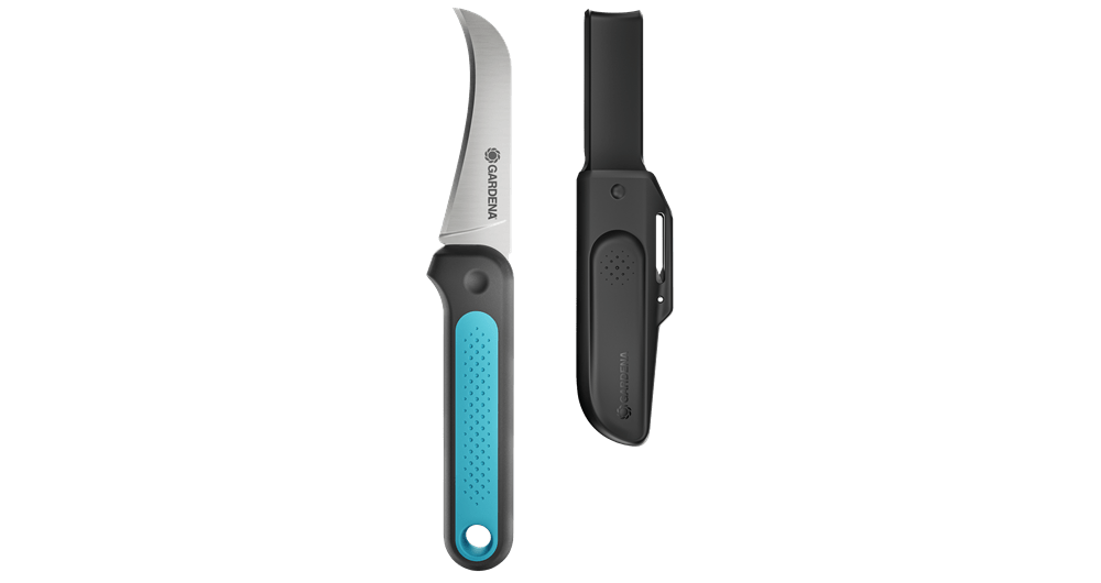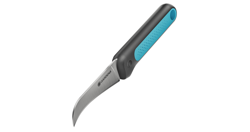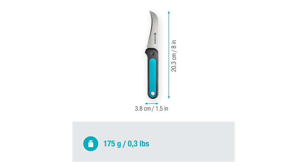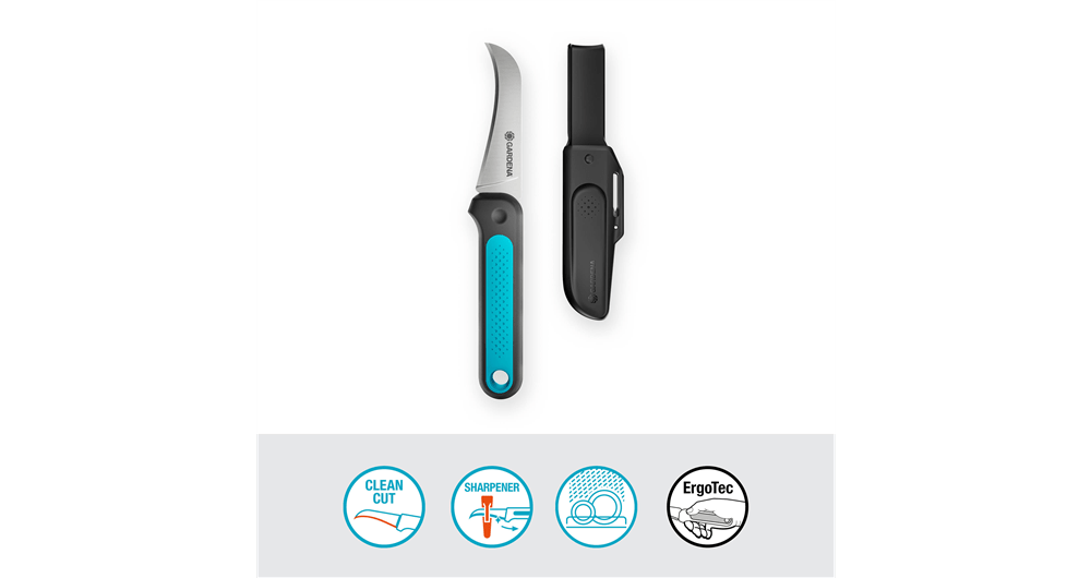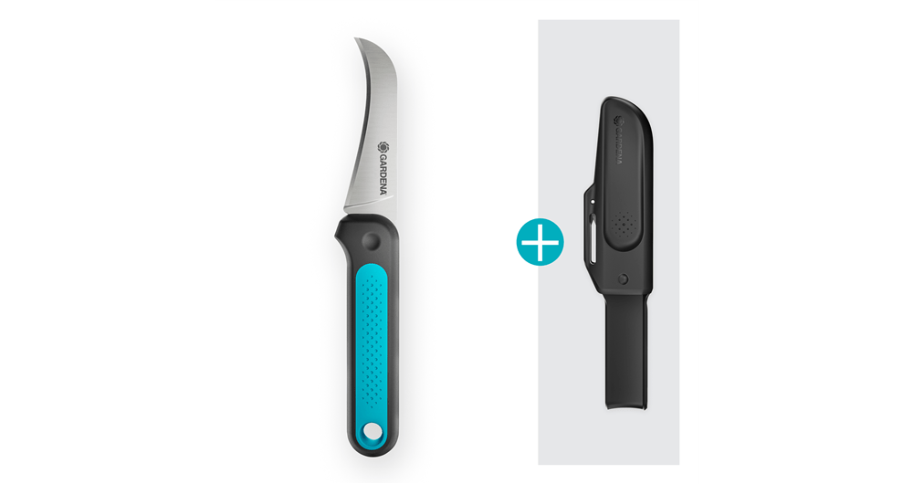 Use the practical VeggieCut from GARDENA to harvest, clean and peel vegetables and lettuce. The sickle-shaped knife is made of durable stainless steel. It allows you to make precise, clean and easy cuts. You can even cut thicker vegetables such as courgettes with just one cut. The included holster helps you in several ways. The German developed knife is always ready to hand when harvesting thanks to the belt holster and can be stored safely. If necessary, use the integrated grinder to sharpen the blade. Thanks to the ergonomic ErgoTec handle, the knife fits comfortably in your hand and is non-slip thanks to the built-in soft components. The food-safe VeggieCut does not transmit any scent or taste. For ideal storage, you can hang it on the kitchen wall, for example, using the eyelet. The harvesting knife is also dishwasher safe and therefore very easy to clean. GARDENA supports the high quality of the VeggieCut with a long manufacturer's warranty of 25 years after registration at gardena.com/registration within 3 months after purchase. Handle with care. GARDENA Micro-Cutting. Give your harvest the respect it deserves with our range of precise tools.