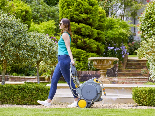 A Hozelock 35M Mobile Auto Reel - the hose which puts itself away, anywhere. This is an automatic reel with a patented rewind system. The braking mechanism ensures a smooth, controlled rewind with no kinks or tangles.